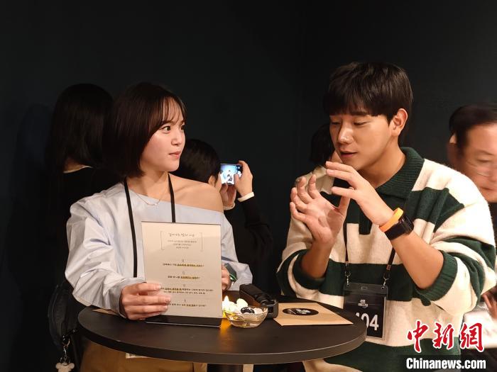 2月14日,“心动·艺术之夜”单身男女相亲活动在首尔举行。图为参与者进行1对1对话互动。季龙雨 摄