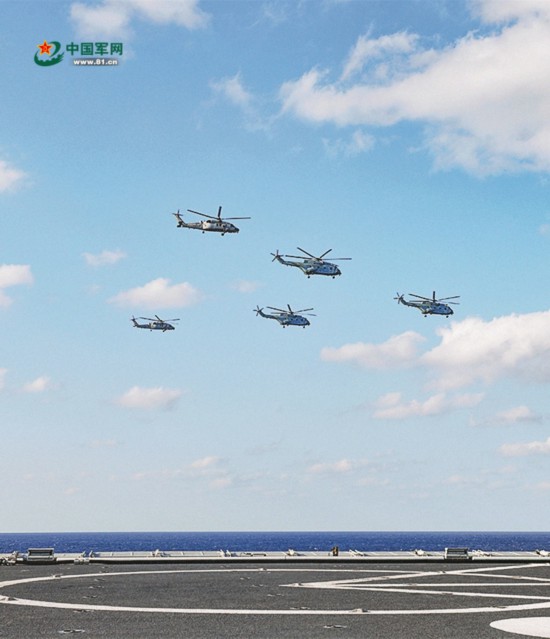 “舰载直升机起降部署!”接到命令,舰载直升机转运小组快速将舰载直升机转运至甲板。铁翼飞旋,数架直升机腾空而起,新一轮训练在海天之间展开。