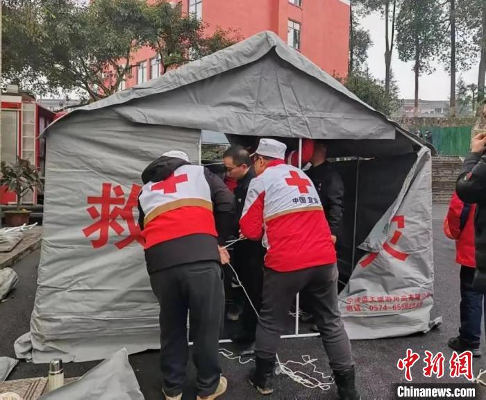 红十字会工作人员在安置点搭建帐篷。四川省红十字会供图