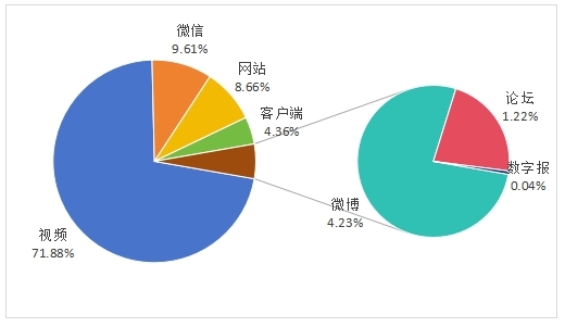 在信息传播渠道上,“消费维权”类信息传播渠道主要有视频、微信、微博、网站、客户端、论坛、数字报等。其中视频信息量最高,占比71.88%;其次是微信,占比9.61%;第三是网站,占比8.66%。