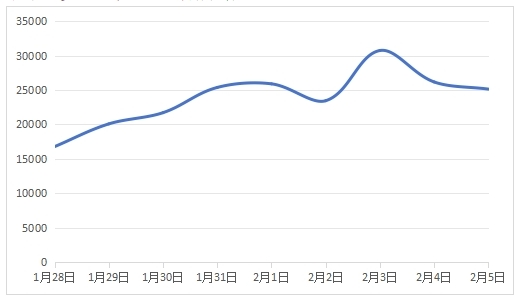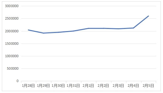在1月28日至2月5日共计9天监测期内,共收集到“消费维权”相关信息18,896,039条,日均约210万条。舆情走势波动平缓,2月5日信息量小幅上扬达到峰值,为2,597,289条。