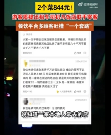 深圳广电“第一现场”:2月3日,湖南张家界。有网友报料称在张家界旅游时,疑遭遇出租车司机和饭店联手宰客。陈女士称,当时打车被出租车司机推荐到一家叫“土家园”的饭店,服务员推荐招牌菜:娃娃鱼和打鼓皮,还说两个菜就够吃了。后面看饭店评价不好,出去一问鱼258元一斤,结账的时候发现两个菜居然要844元!记者在餐饮平台发现多名顾客吐槽有类似经历。2月6日下午,官方通报称,涉事餐饮店“土家园”存在支付出租车司机回扣招揽客人等宰客行为。目前,已责令涉事经营主体停业并对其进行立案调查。