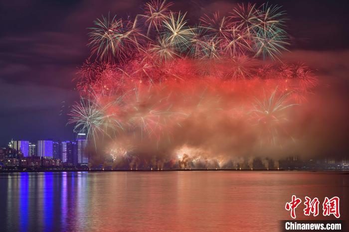 当晚九时,一声声震耳欲聋的轰鸣划破夜空,数万枚烟花腾空而起,场面震撼。此次烟花秀燃放等级为Ⅰ级,采用的礼花弹是中国允许生产制造燃放的最大规格,烟花燃放半径超过250米。