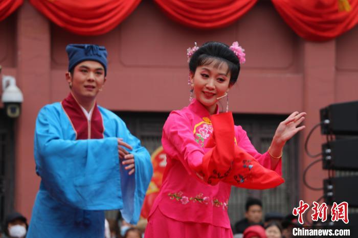 “夫妻二个城门进,抬起头来看啦看花灯……”当日,黄梅戏演员们粉墨登场,表演了黄梅戏经典剧目《夫妻观灯》。婉转的唱腔、精美的服饰,一招一式尽显功底,让观众领略了传统戏曲的独特魅力。