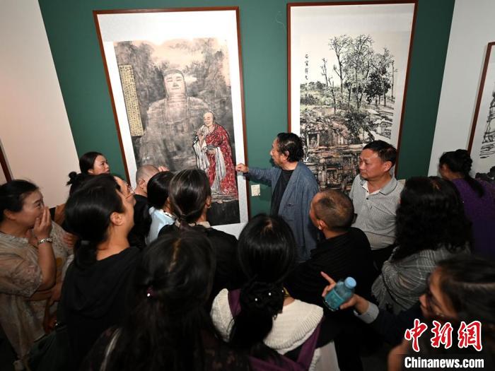 中新网乐山4月25日电 (记者 刘忠俊)4月25日,“崖上画卷·华夏艺韵——世界石窟遗产艺术作品展”在四川省乐山市博物馆开幕,展览以敦煌、云冈、龙门、大足、乐山五大石窟为创作蓝本,汇集国画、油画、水彩、摄影及雕塑等120余件作品,通过跨媒介艺术语言展现石窟艺术的当代生命力。